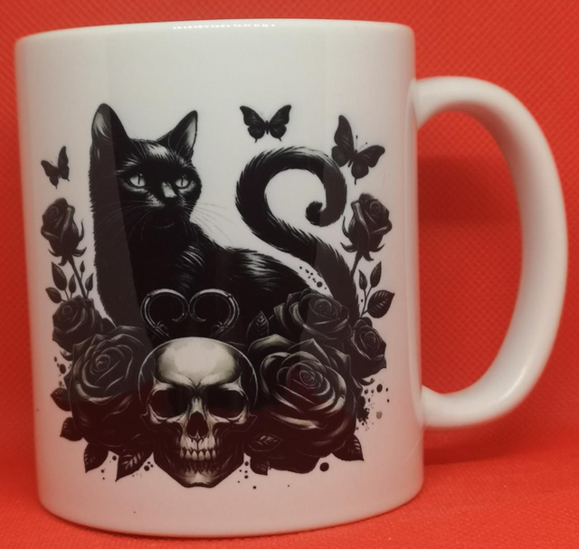 Custom Printed Black Cat with Skulls and Butterflies Mug.