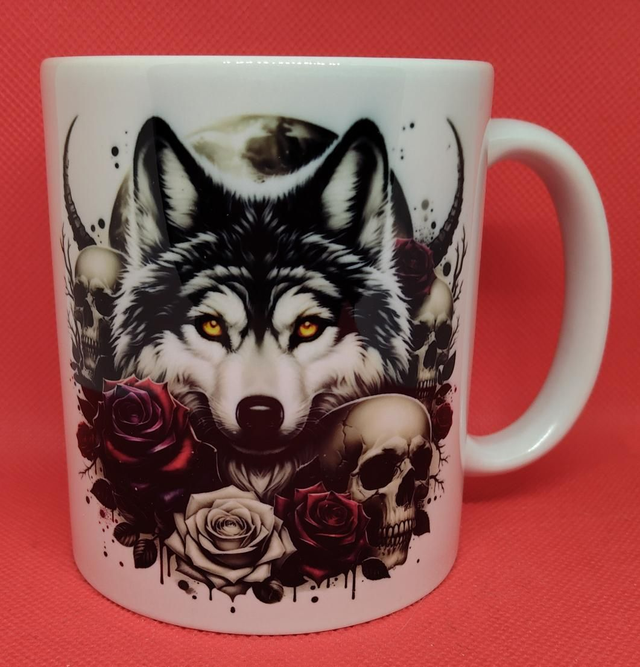 Custom Printed Wolf With Roses and Skulls Mug.