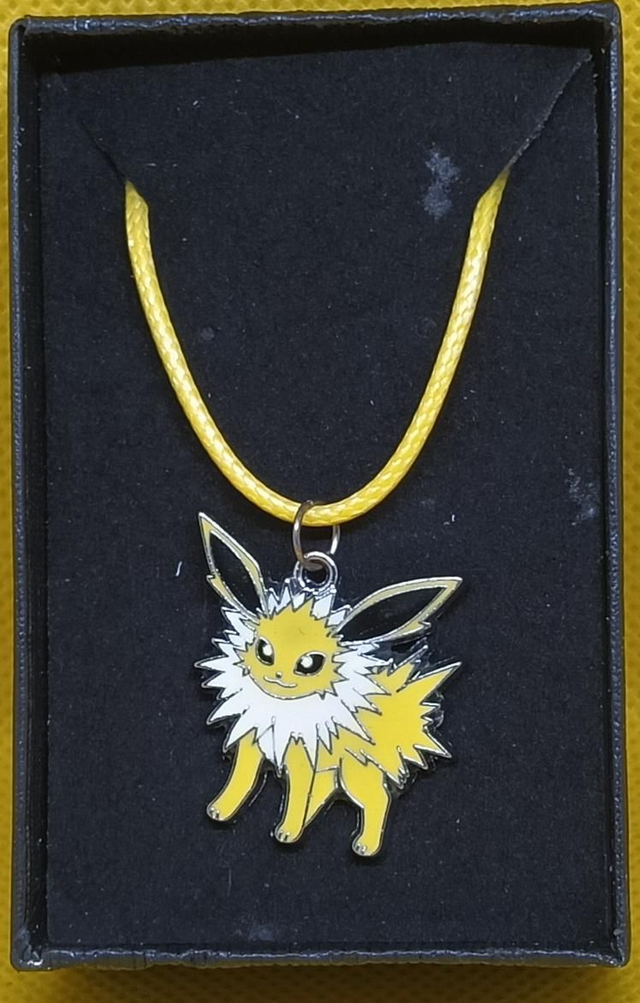 Enamel Pokémon Jolteon Pendant on a 18" Yellow Waxed Cord in a Black Gift Box.