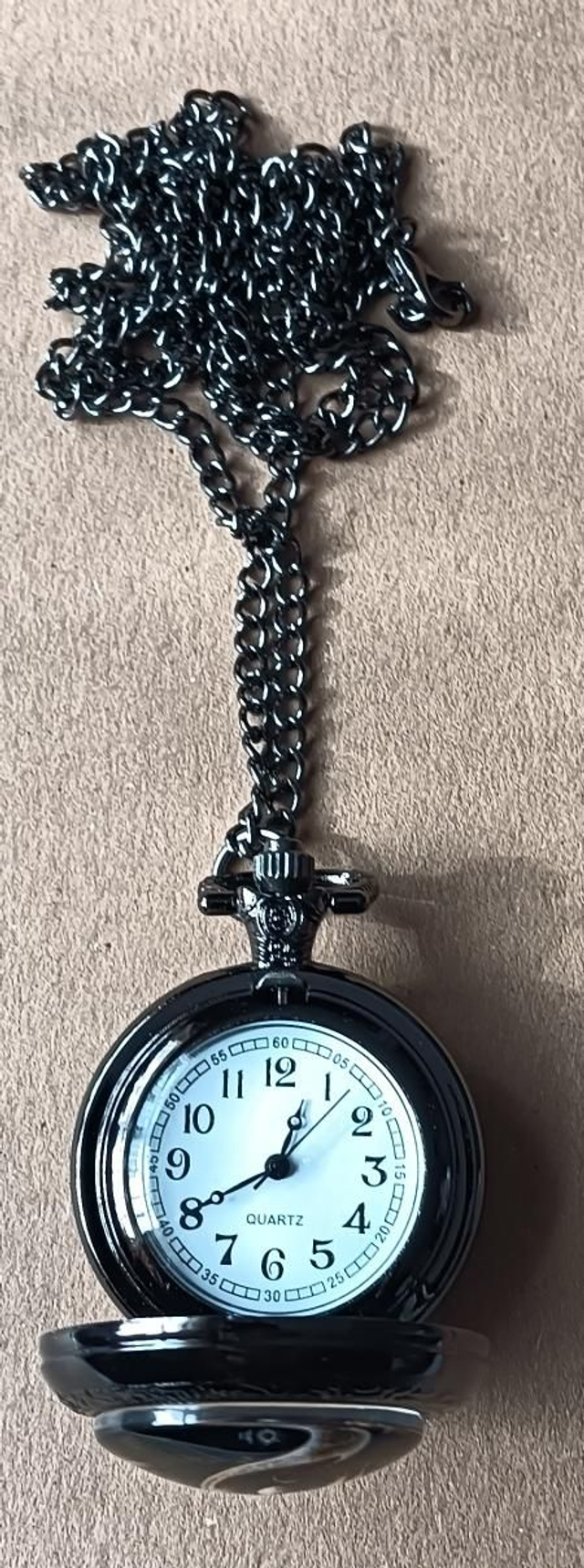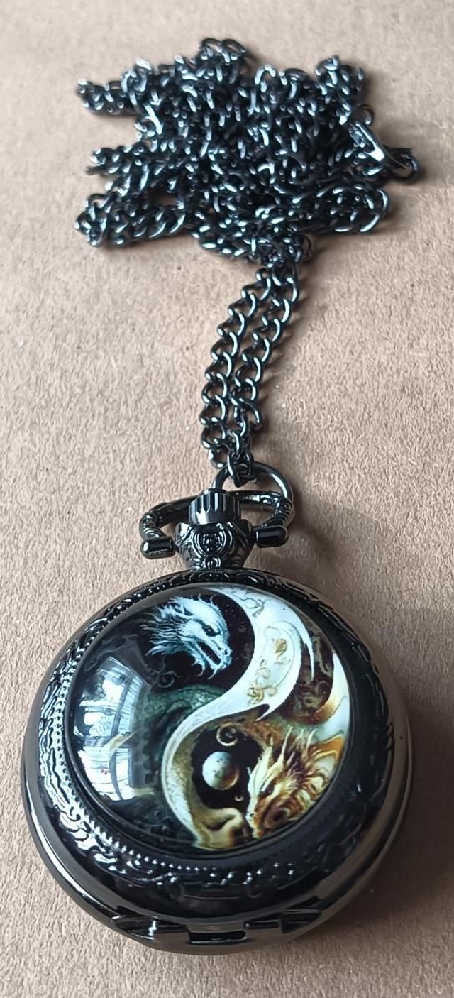Small Black Pocket Watch with Dragon Yin Yang Design on the front.