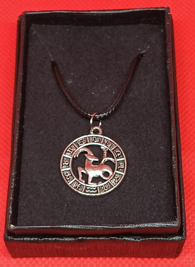 Tibetan Silver Capricorn Horoscope Pendant on a 22 inch Black Cord presented in a Black Gift Box.