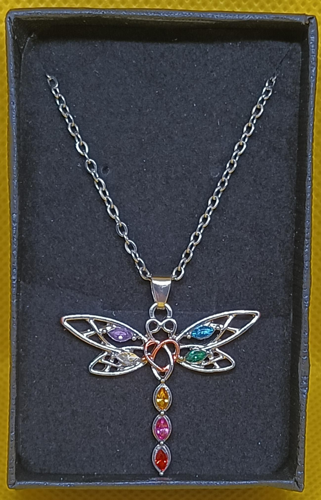 Tibetan Silver Chakra Dragonfly Pendant on a 18" Silver Plated Chain Presented in a Black Gift Box.